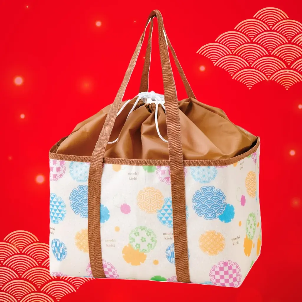 『三千円福袋』は、もち吉の人気のあられ・おせんべいに加え、もち吉特製の『きなこもち』を全ての袋に必ず1品入れて販売する福袋です。袋自体は保冷機能が付いた横幅37cm×高さ24.5cm×マチ21cmの“レジかごサイズ”で、使用後はエコバッグとして再利用できる仕様です。