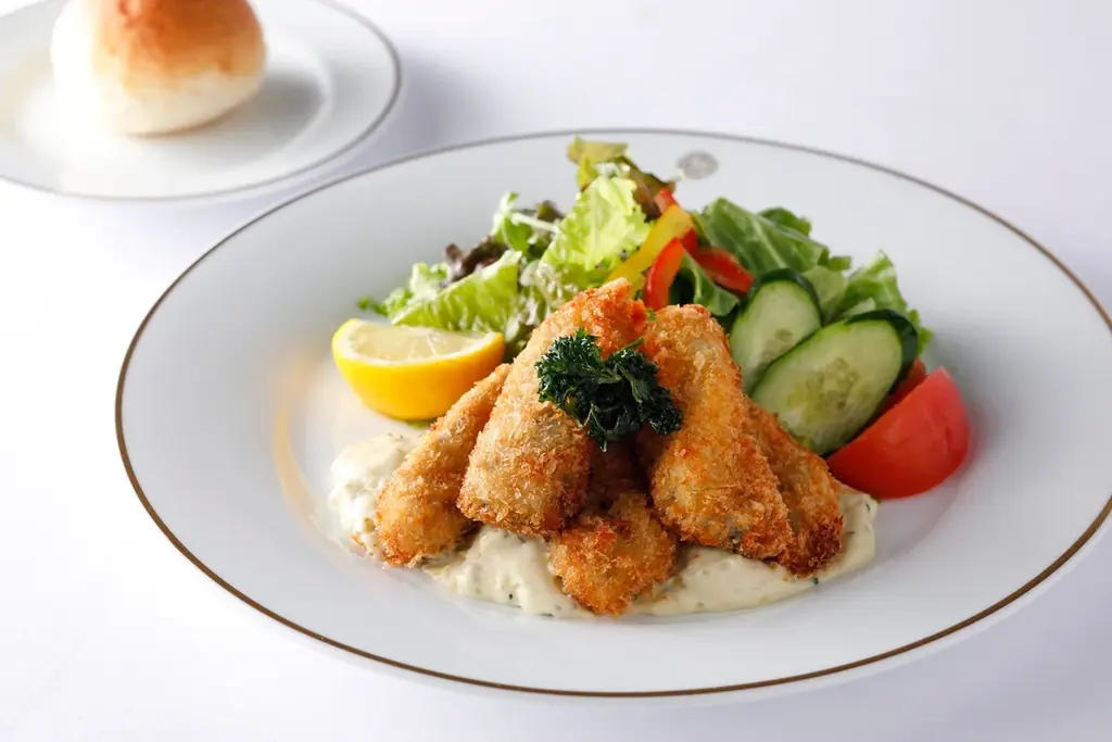 ミルキーな味わいが特長の広島県産牡蠣を使用した牡蠣フライです。揚げたての食感と磯の香りを楽しめる一品で、自家製タルタルソースが添えられます。パンまたはライスが付属します。