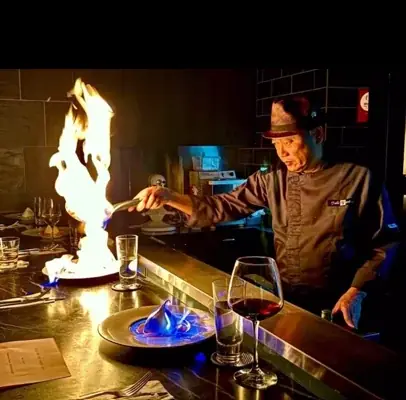 この手法は味だけでなく、仕上げの音や炎、香りなども含めて五感で楽しむことを意図しており、前菜やメインなどの料理も同様にライブ感を重視した提供になるとされています。