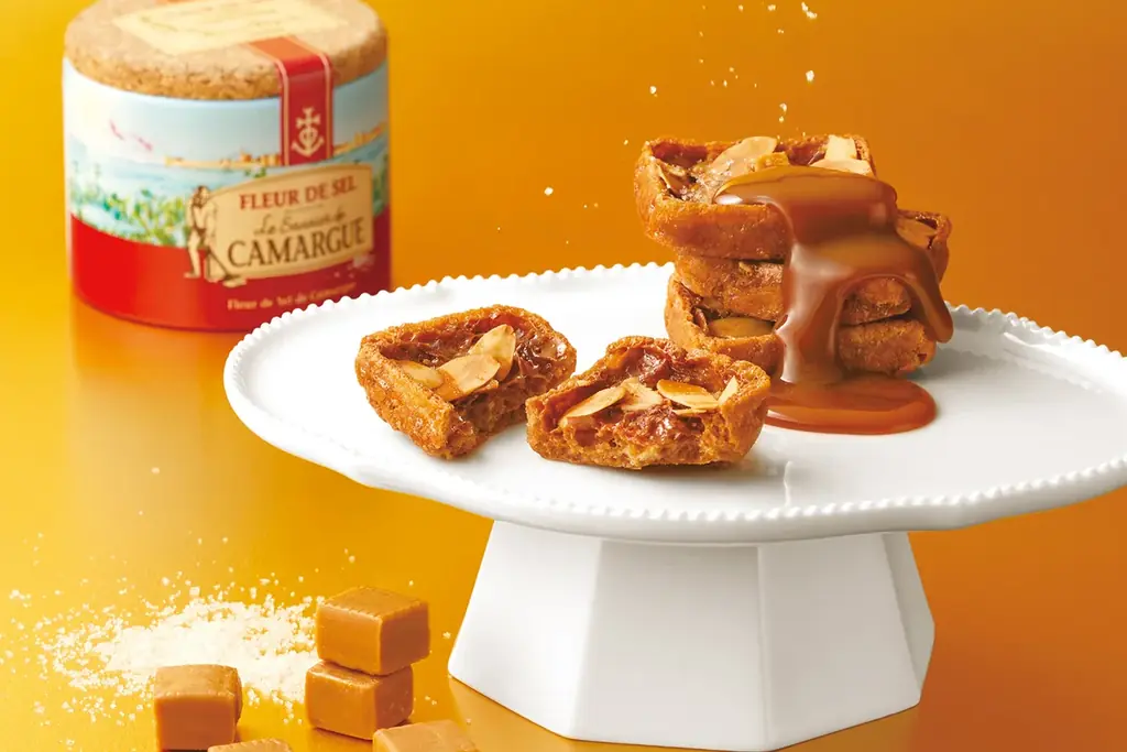 特徴:南仏カマルグ産の完全天日塩(フルール・ド・セル)を使用し、職人が丁寧に炊き上げたキャラメルとアーモンドスライスをトッピングして香ばしく焼き上げた焼菓子タイプのシュー皮を採用。塩キャラメルの濃厚で深みのある味わいと、驚きの口どけを目指しています。