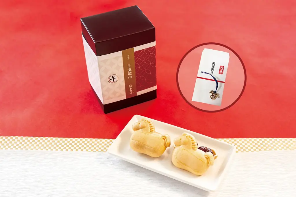 - 船橋屋:干支最中(午)とお守りのセット ¥2,250(福袋限定)。場所:タワーヤード2階。数量:限定30個。大納言あずき餡と香ばしい最中皮が特徴。