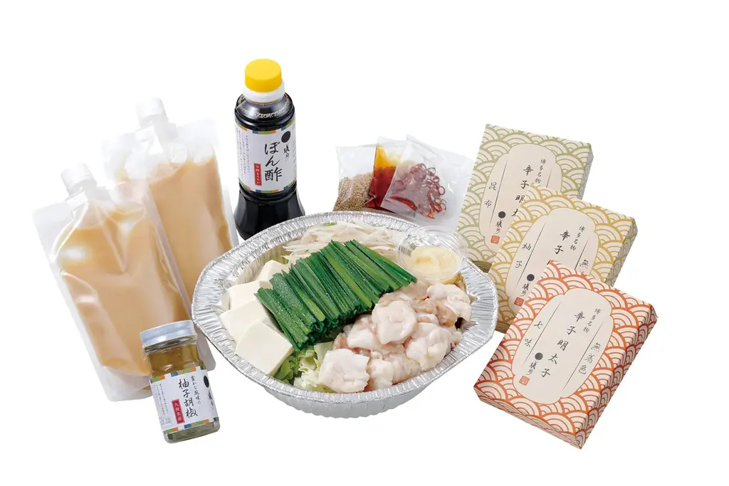 - 蟻月:テイクアウト用もつ鍋(2人前)+お取り寄せ商品セット ¥5,000。場所:イーストヤード31階。数量限定。内容に含まれる明太子は写真と異なりランダムで1つ。
