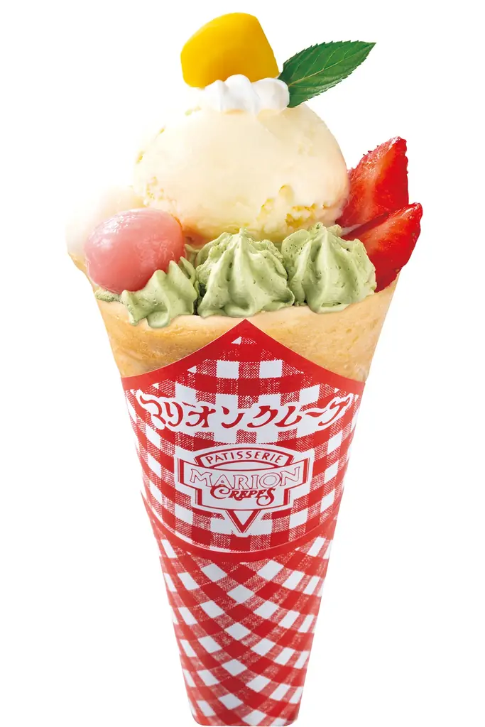 - マリオンクレープ:「いちご鏡もちクレープ」 ¥850。場所:イーストヤード1階。数量限定。抹茶ホイップ、紅白白玉、栗を添えた縁起物の意匠。