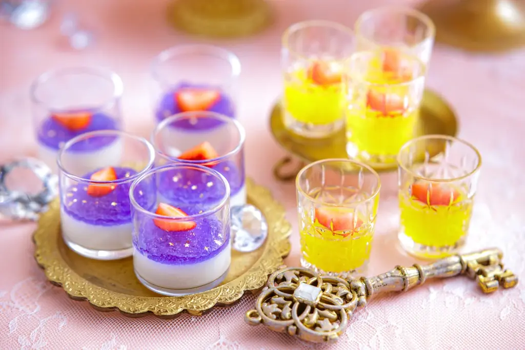 - バタフライピーとヨーグルトジュレ:鮮やかな紫色のバタフライピーとヨーグルトの爽やかな酸味を2層で仕立て、透明感のある美しさとリフレッシュ感を両立。