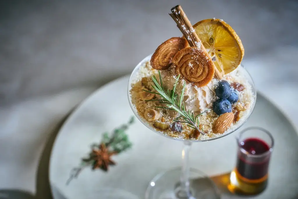Montblanc Snow Parfaitは、米粉や豆乳クリームなど植物由来の食材を中心に、食感と味わいのバランスを重視して設計されています。グラスの中は、紅茶のジュレやラムレーズン、米粉クランブルなど複数の層で構成され、温度差や歯触りのコントラストによって一口ごとに異なる印象が得られるようになっています。