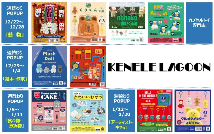 | KENELE LAGOON(ケンエレスタンド) | 開催中~2026年1月20日(火) | カプセルトイのポップアップ。週替わりPOPUPも展開。 | 取扱商品は変更となる場合あり。商品欠品の可能性あり。 |