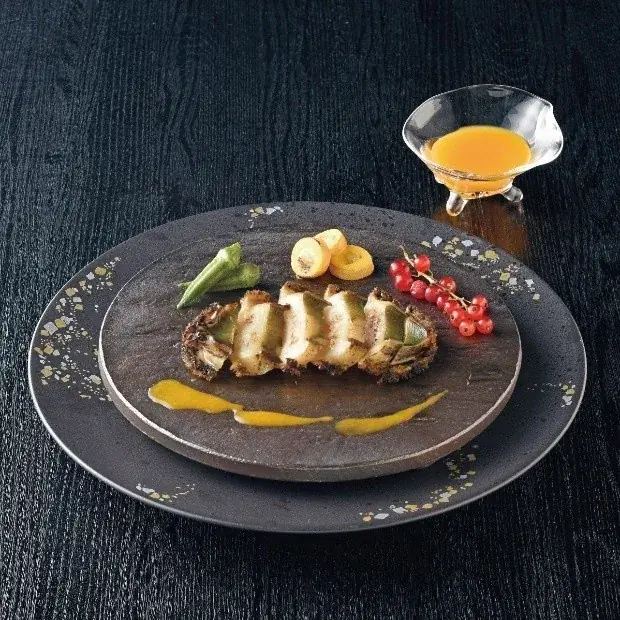 - 強火で焼き上げた肉厚の天然鮑。自家製ウニソースと組み合わせた品。30,000ポイント