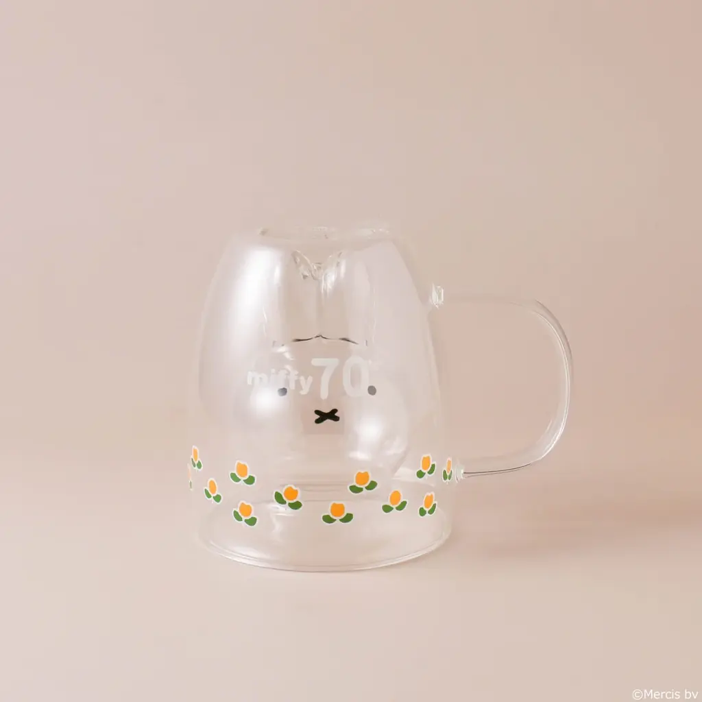 ミッフィー生誕70周年を記念した特別仕様マグの登場──透明なガラスに施された記念ロゴと花のモチーフ