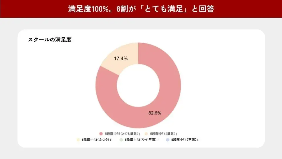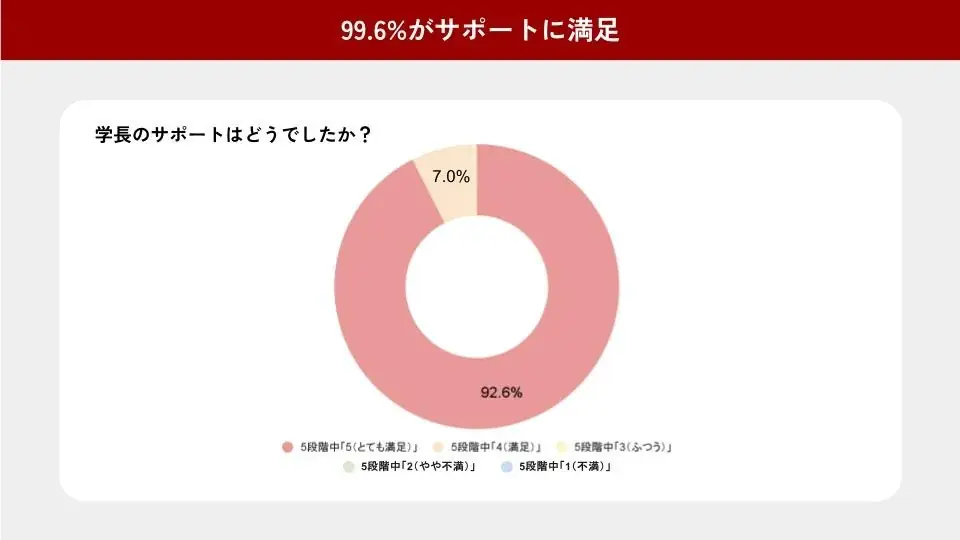 | 主要結果 | スクール満足度100%が「満足した」と回答、学長サポート99.6%が「良かった」と回答。満足度平均(別案):スクール4.87、学長4.92(5段階) |