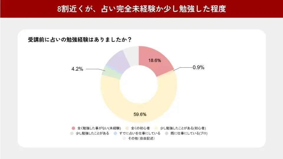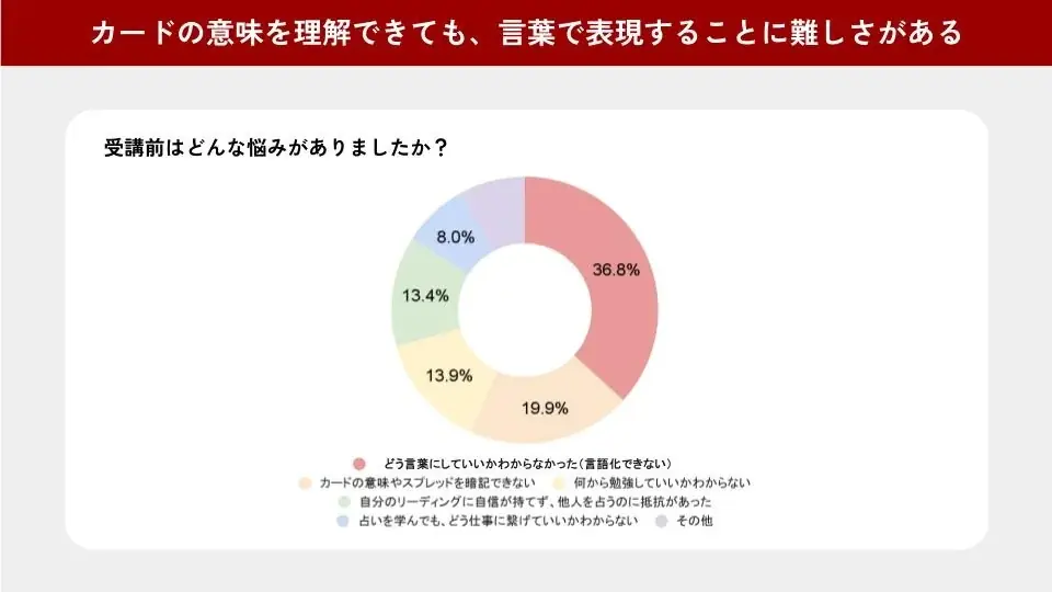 アンケートからは、受講前の占い経験に関して「全くの初心者」と「少し勉強したことがある」の合計が78.1%であり、初心者層が大多数を占めていることが分かります。受講後の変化としては「タロットリーディングができるようになった」「カードの意味を理解できた」「言語化力が身についた」といった回答が多数を占めています。