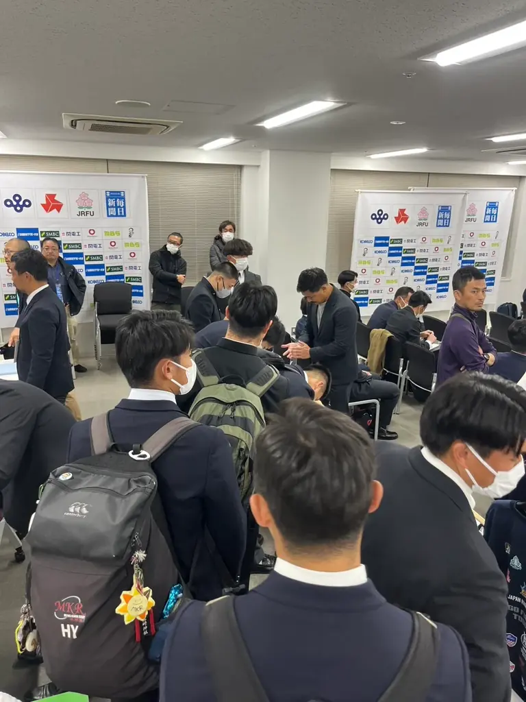絵馬集積から奉納までの主な日程は次の通りです。12月6日に大会抽選会が開催され、そこに出席した代表選手一人ひとりに対して、社会人最高峰リーグ リーグワンに所属する横浜キヤノンイーグルスの天野寿紀選手が絵馬を手渡し、回収を行いました。回収された絵馬は本事業の発起人である菊谷崇氏に託され、下鴨神社へ持ち込まれました。12月17日には下鴨神社の禮殿にて神職による祈祷が執り行われ、大会の成功と選手たちの健闘ならびに大会期間中の安全が祈願された後、雑太社へ奉納されています。