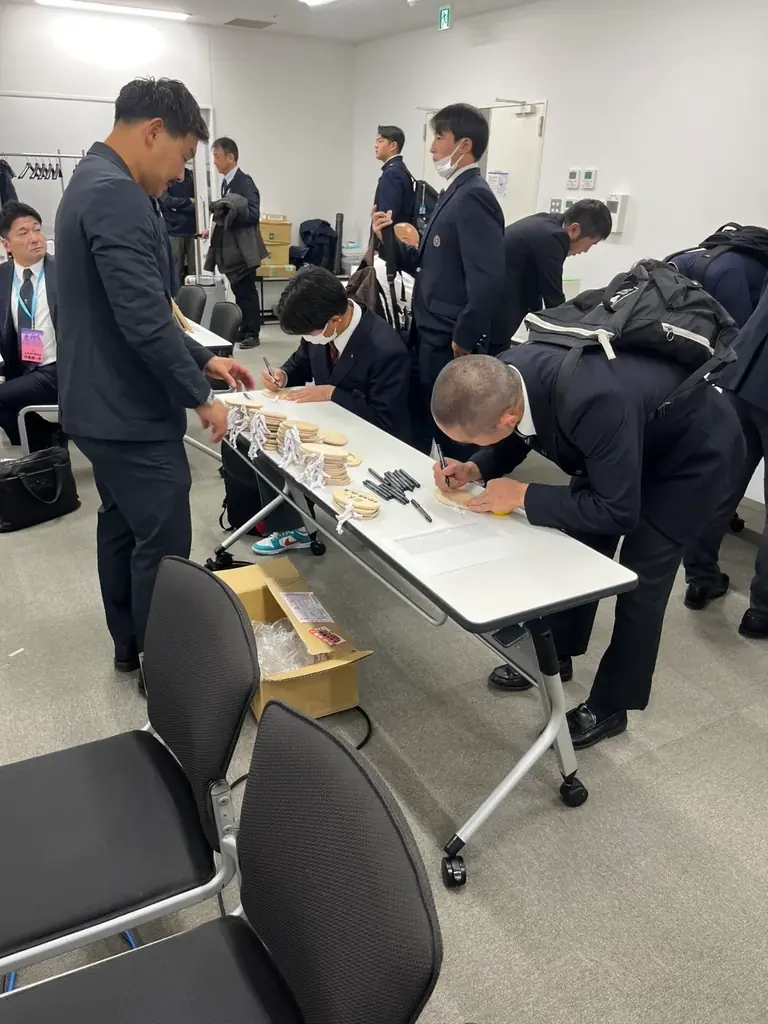 12月6日に行われた大会抽選会では、天野寿紀選手が出場校代表者へ直接絵馬を手渡しました。選手たちが記した絵馬はそれぞれ個別に受け取られ、天野選手が回収と一時預かりを担当しました。回収された絵馬は発起人の菊谷崇氏へ託され、下鴨神社へ届けられました。