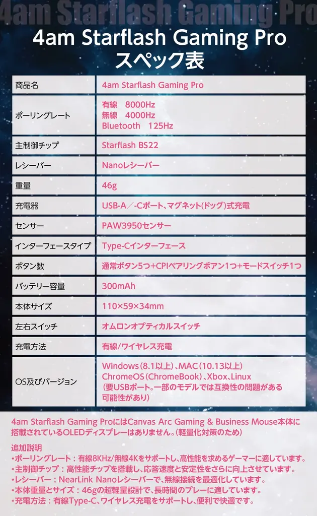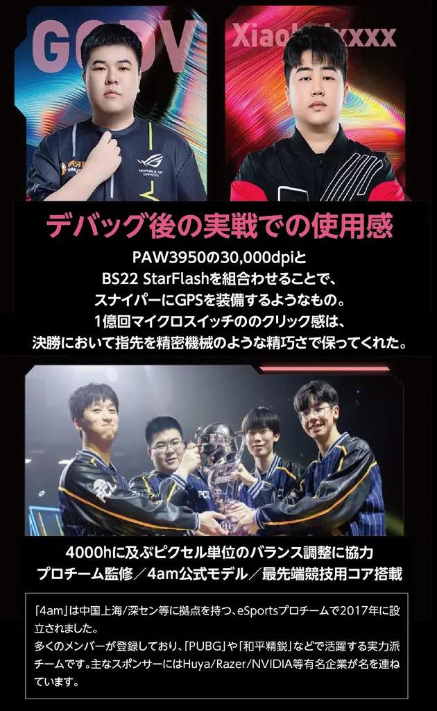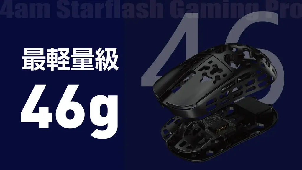 4am Starflash Gaming Proはe-Sports競技用途にフォーカスしたモデルで、極限の反応速度と高いトラッキング精度が追求されています。共同開発パートナーである「4am」の要求を反映し、プロ競技水準のパフォーマンスが目指されています。
