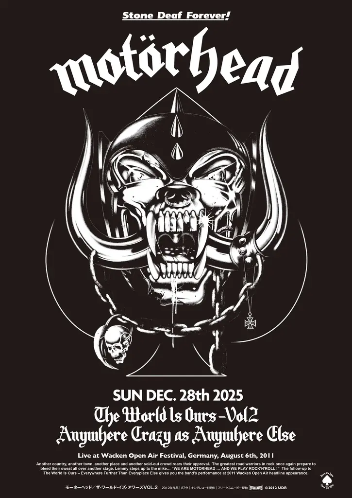イギリスの伝説的バンド、モーターヘッドのフロントマンであるレミー・キルミスターが2015年12月28日に逝去してから10年目にあたる同日に、ライヴ映像作品『モーターヘッド/ザ・ワールド・イズ・アワーズ VOL.2』の一夜限定上映が決定した。上映日は2025年12月28日(日)で、シネマート新宿スクリーン1にて1回のみの特別上映となる。