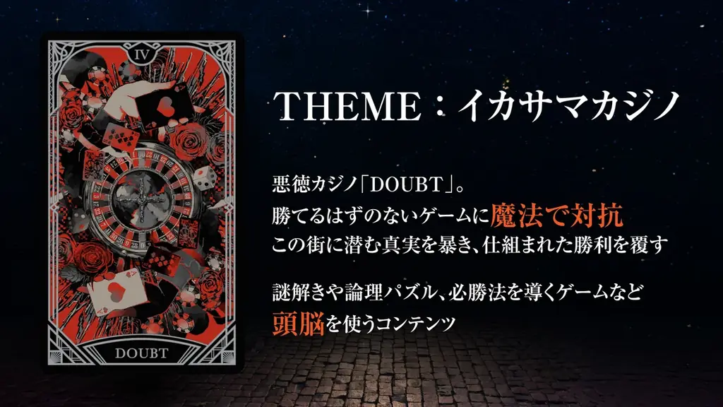 噂の闇カジノへ潜入捜査するストーリーで、謎解きや論理パズル、必勝法を導くゲームなど知的挑戦が中心です。魔力を持たない人間を誘い込む構造を暴く内容です。