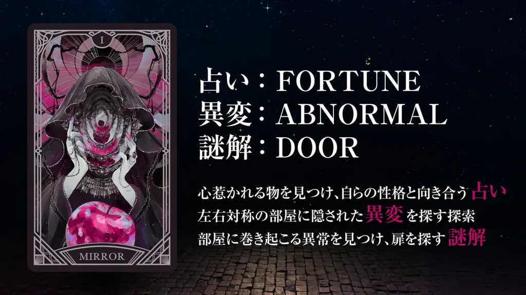 ストーリーは「魔女によって魔法がかけられた部屋。現実と鏡の世界が入り混じった場所」。占い・探索・謎解の3種が用意されており、短時間からしっかり遊べるメニュー構成です。