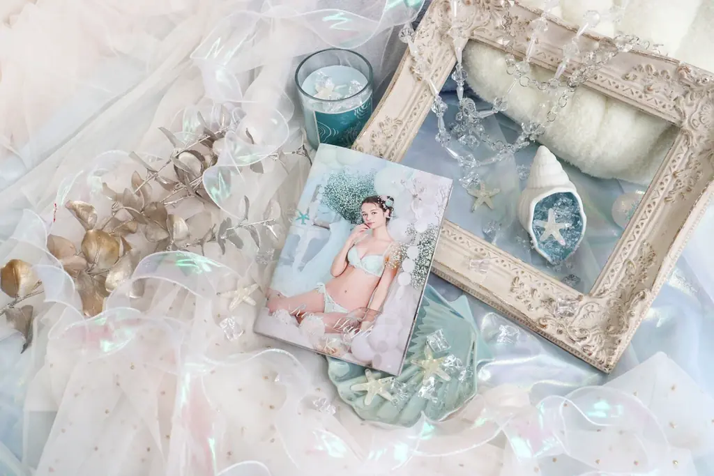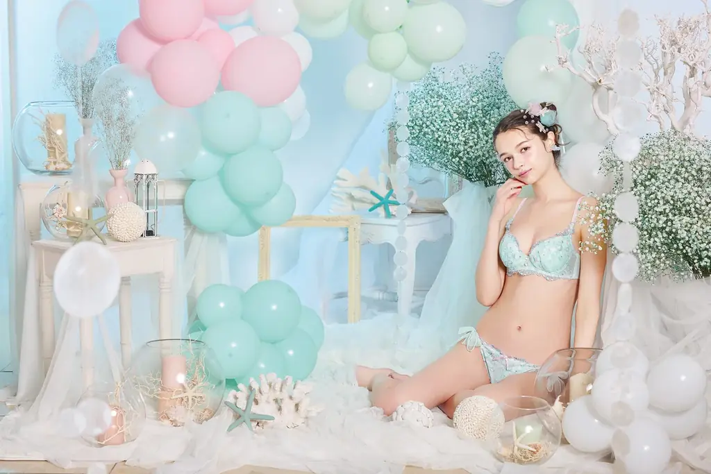 アンチェではお花モチーフを使用せず、立体感のある円形パターンで透明感や煌めきを表現。カタログ撮影では海のカラーと統一されたバルーンや球体のヘアアクセサリー、透明感のあるビーズ、ヒトデなどを小物に用い、世界観を一貫して演出しています。
