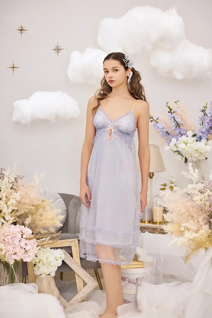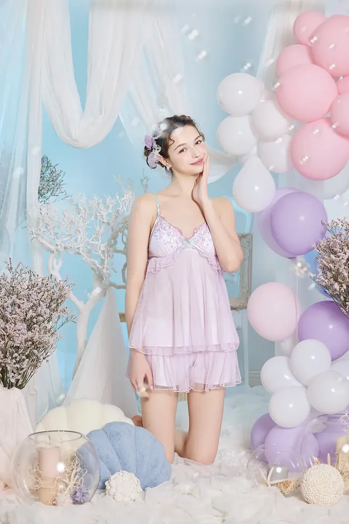 | リサマリ | アント―ニア | カップ付きキャミソール ¥6,160、タップパンツ ¥3,740、ランジェリーポーチ ¥5,830、カップ付きマキシワンピース ¥8,800(すべて税込) | ユニコーンやバンビ、雲と星・虹のロマンチック世界 |