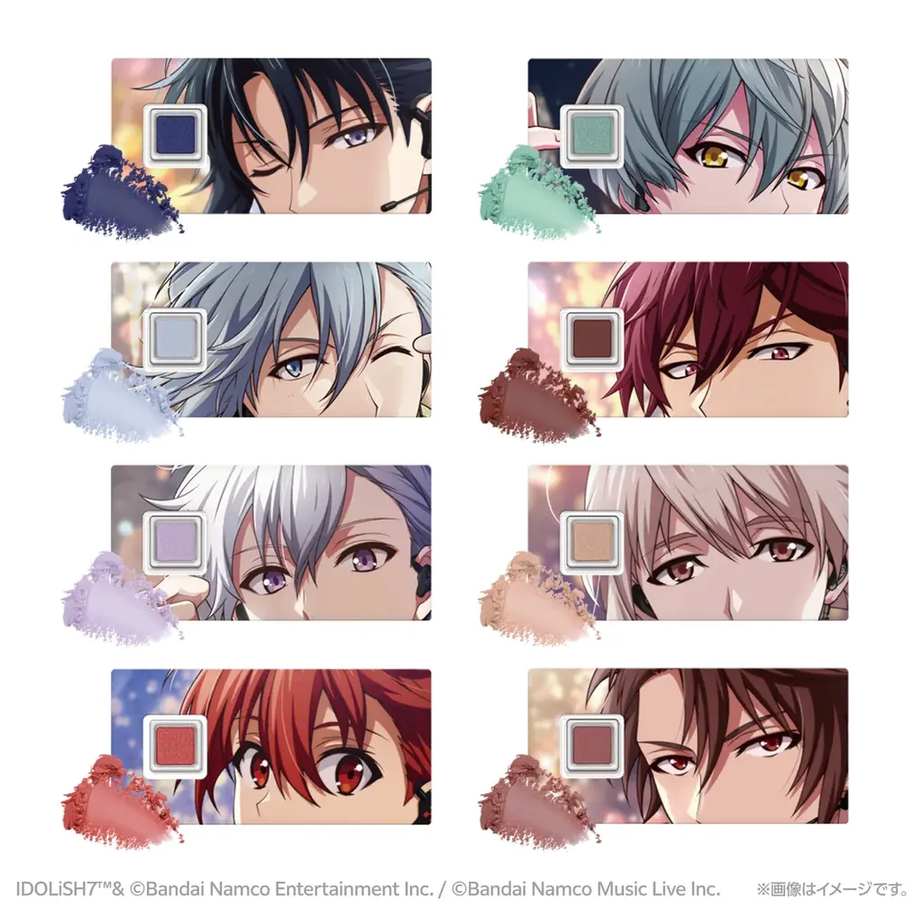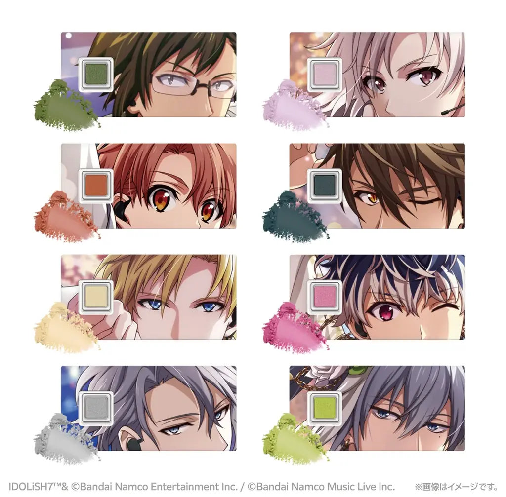 Vol.1(全8種):和泉一織、四葉環、逢坂壮五、七瀬陸、亥清悠、狗丸トウマ、棗巳波、御堂虎於。これらは個々のビジュアルとイメージカラーを反映したカラーパウダーが封入されます。