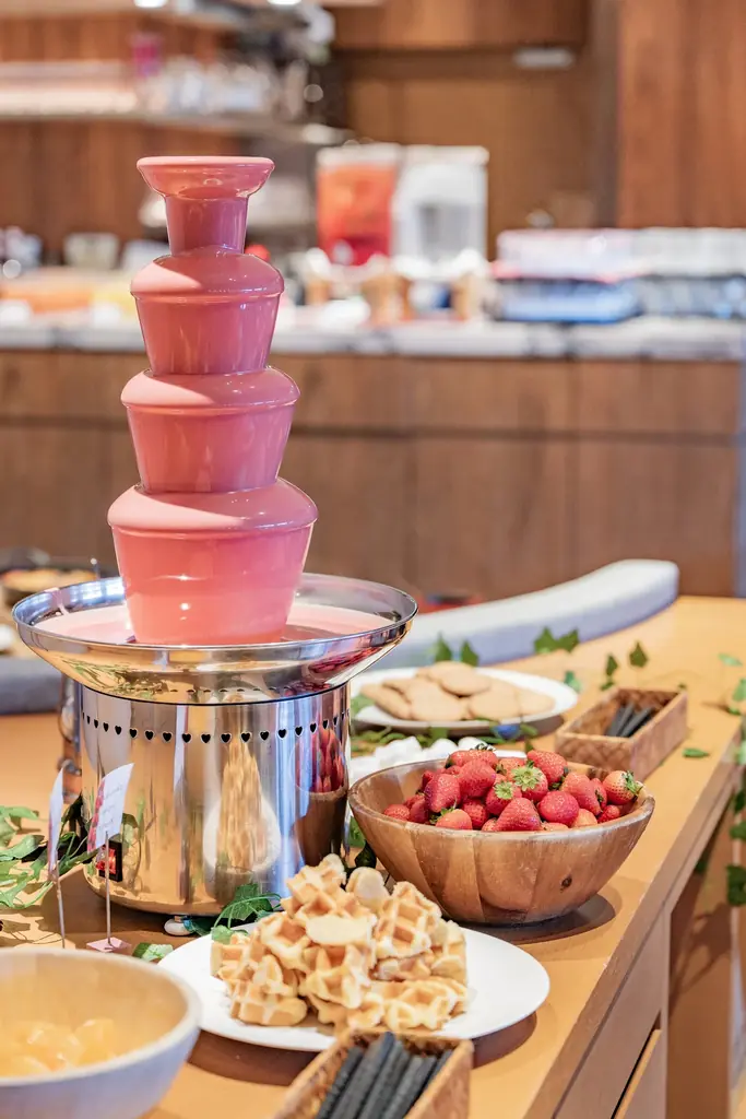 ビュッフェと並んで注目されるのが、会場で実施される体験型のコンテンツです。なかでも前回好評だった「いちごチョコファウンテン」は今回も登場し、参加者はチョコレートにフルーツやマシュマロなどをディップしてから好みでデコレーションまで楽しめます。会場には甘い香りが広がる演出がなされます。