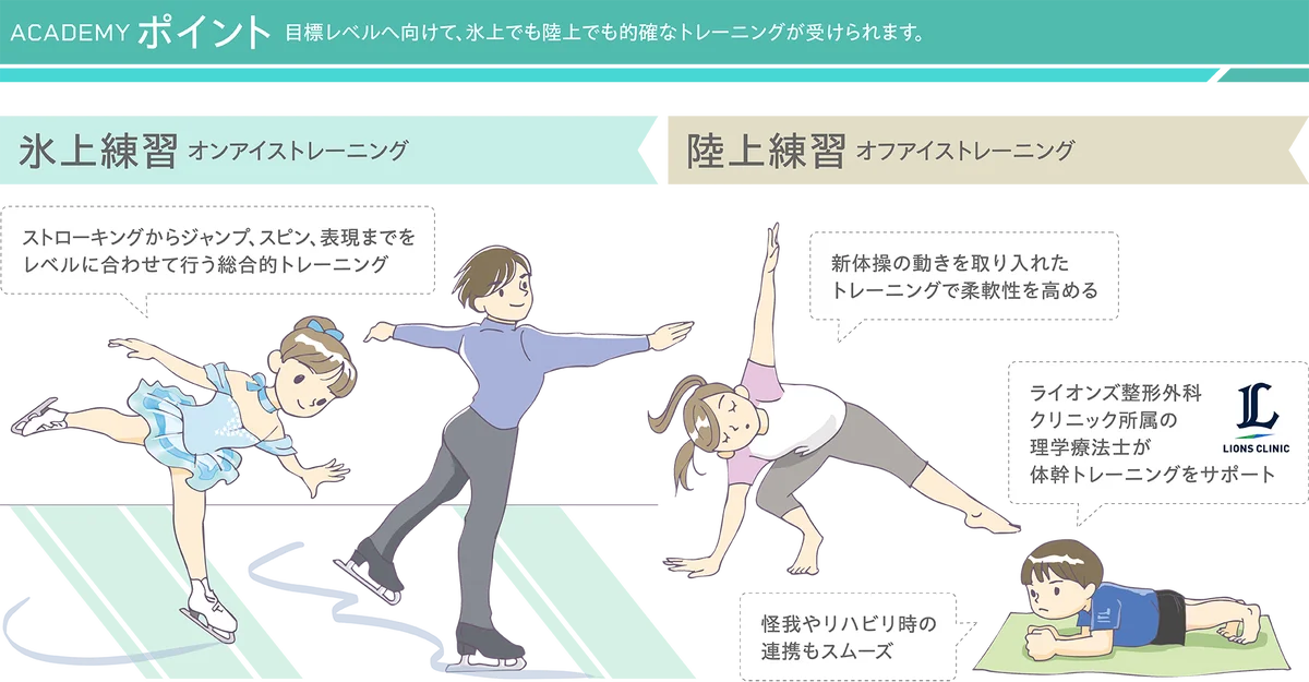 アカデミーでは氷上練習に加え、〈オフアイストレーニング〉を導入します。これは一般社団法人ARMSが運営する「ライオンズ整形外科クリニック」との連携により、体幹トレーニングや怪我予防対策に精通した理学療法士がプログラムを担当することが特徴です。