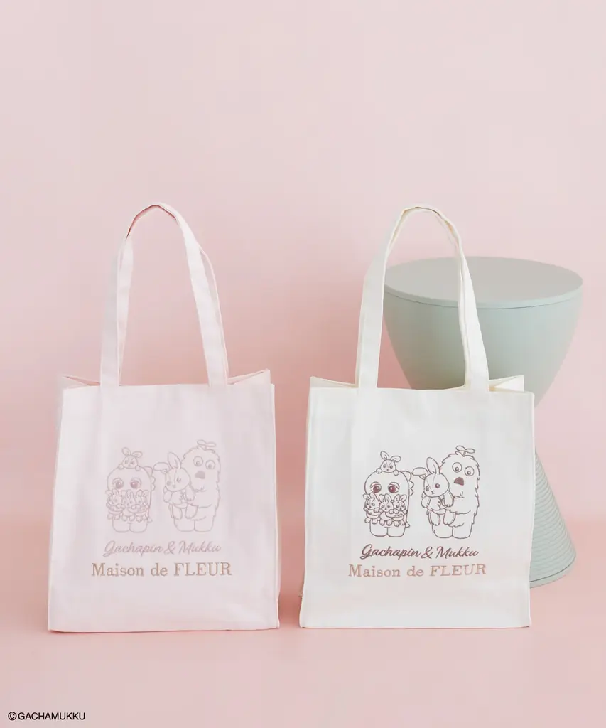 - うさぎモチーフの刺繍:Maison de FLEURで人気のうさぎモチーフを刺繍で施したアイテムを用意。キャンバス生地のスクエアトートでは、ガチャピン・ムックがうさぎを抱える情景を刺繍で表現しています。