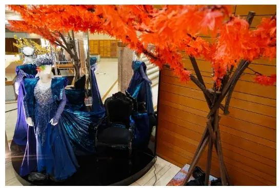 展示作品の中でも特に見どころとされるのが、モーツァルトのオペラ『魔笛』より夜の女王の衣裳です。真っ赤に燃える紅葉を思わせる装飾は、女性の激しい感情を象徴するかのような意匠で、紅葉の葉は1枚1枚手作業で製作されています。