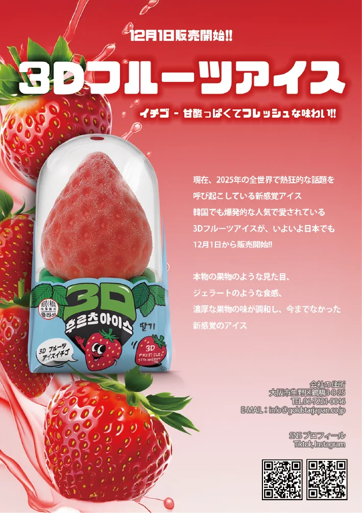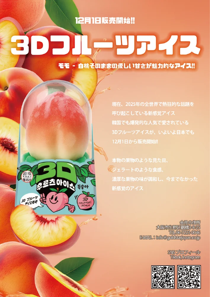 「3Dフルーツアイス」は立体的な造形で果実をそのまま切り取ったかのような表現を施したアイスです。従来の平坦なアイスの概念を変えるビジュアルが特徴で、桃やイチゴなどの果実の鮮やかな色合いと濃厚な味わいを楽しめる設計になっています。