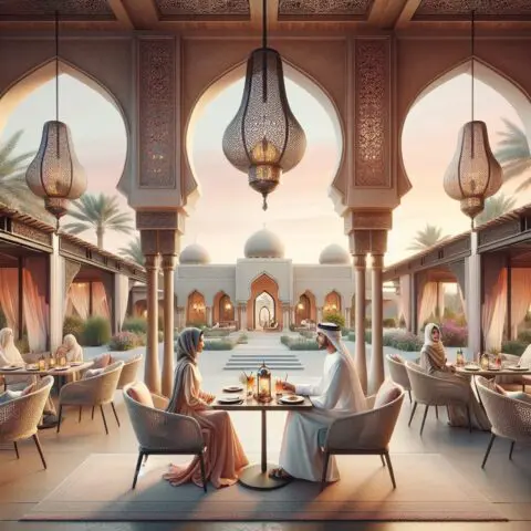 レストランの内装は、白を基調とした洗練されたデザインで、アラブの伝統的なモチーフとモダンなスタイルが見事に融合しています。高い天井と広々とした空間は、食事を楽しむのに最適な環境を提供しています。