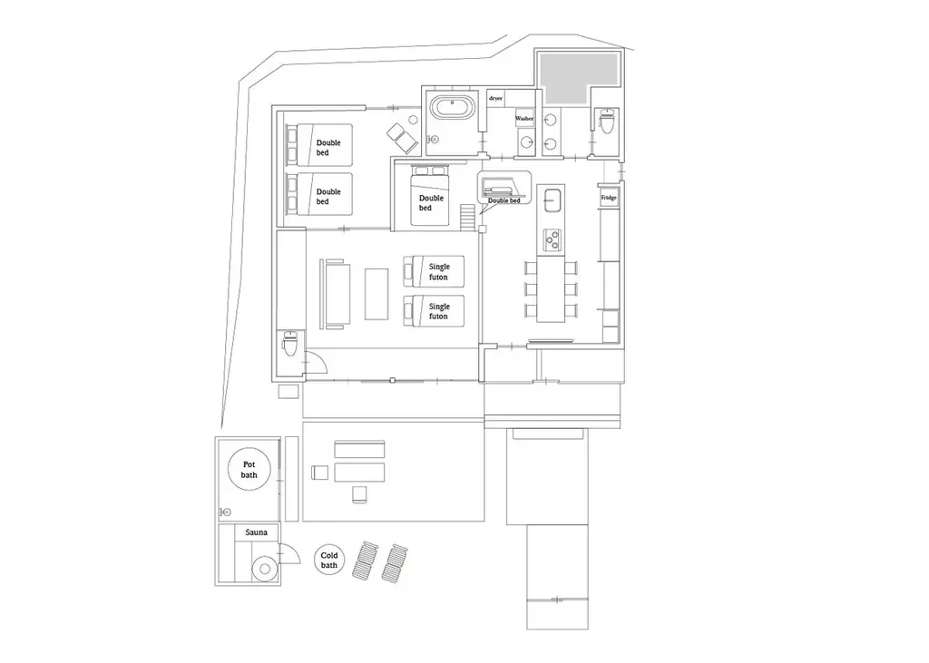この組み合わせにより、家族やグループでそれぞれのプライベートを確保しつつ、最大10名での滞在を想定しています。水回りは最大10名対応で、シングルボウルとダブルボウルの洗面や洗濯機・乾燥機を備え、長期滞在にも配慮された設備です。