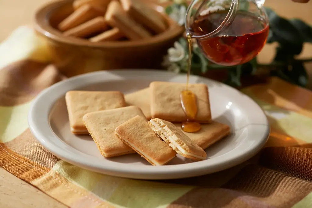 メープルシュガー生地にチェダーチーズ(チーズ中チェダー60%)を練り込み、バニラ風味のホワイトチョコをサンド。サクサク食感でメープルの甘さとチーズの香ばしさが合わさる味わいです。
