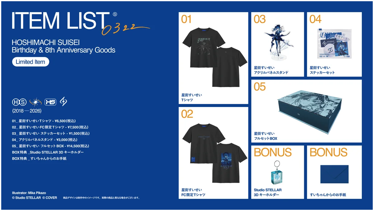 | オンラインストア | アニバーサリーグッズ販売中:https://hoshimachi-suisei-fc.jp/onlinestore/ |