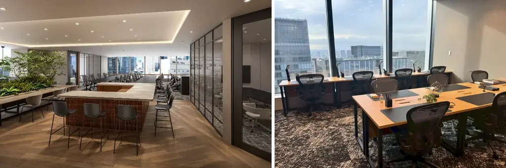 EXEVIA TOKYO YAESUは10階と41階に拠点を設け、フロアごとに役割を明確化しています。10階は全ての執務室が窓に面する設計とし、専有部内に会議室や1名用ブースを備え、柔軟なレイアウトを採用しています。41階は共用のラウンジやホスピタリティ重視の空間を有し、眺望を活かした場づくりが特徴です。