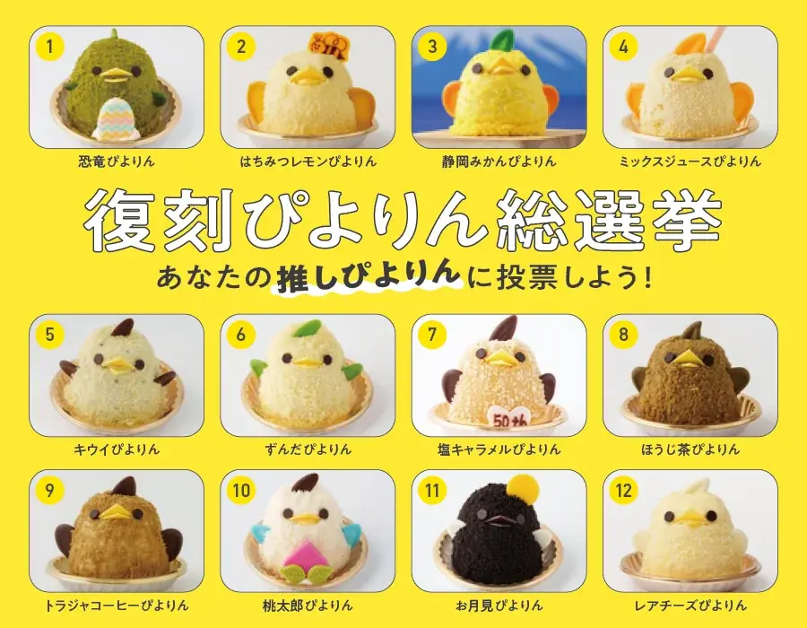 - 内 容:ぴよりん総選挙投票券、上位2つに選ばれたぴよりん2種の限定アソート
