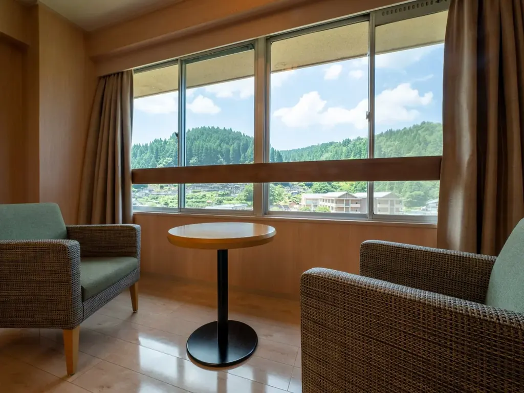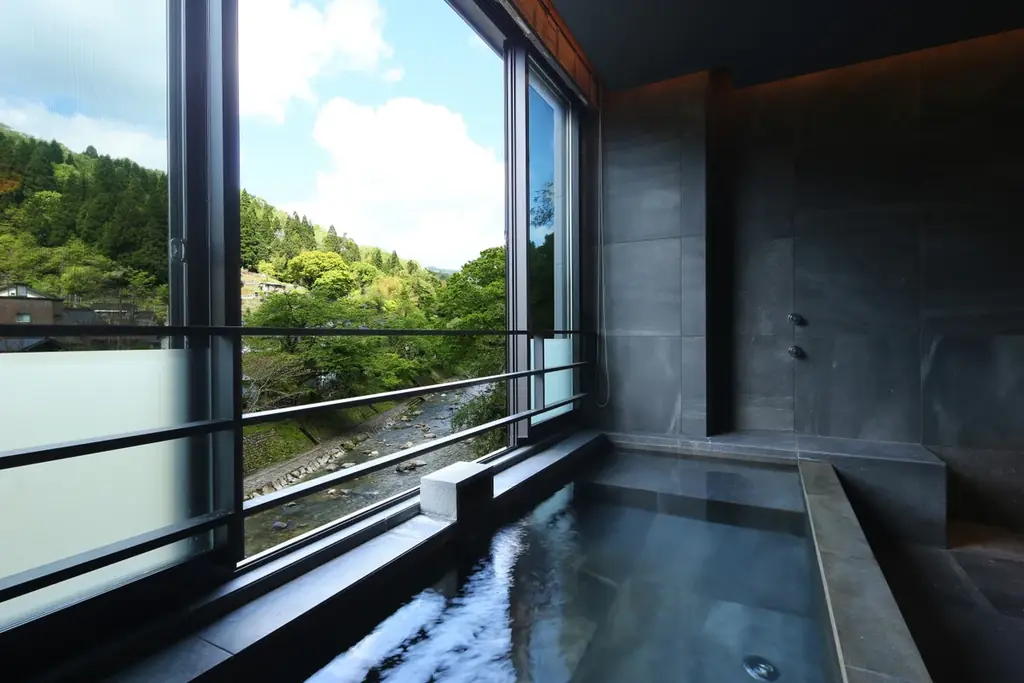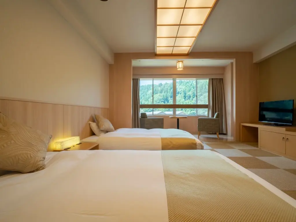 ベッドはデュベスタイルの羽毛布団を使用するローベッドタイプで、チェックイン直後からくつろげる工夫が施されています。窓からは春来川を見下ろす景観が楽しめます。