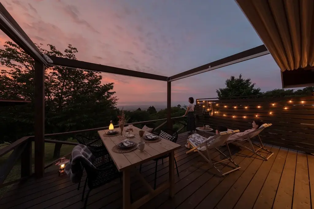 宿泊:エトワ笠間(ETOWA KASAMA):愛宕山山頂にあるアウトドアリゾートで、3種類のキャビンとグランピングテントを備えます。夜は星空や夜景を楽しめる非日常の宿泊体験を提供します。