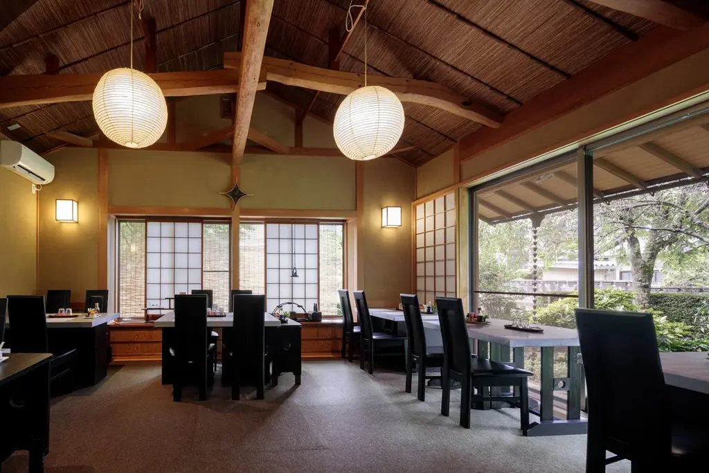 カフェは一軒家の造りで、洋間と和室のいずれも椅子席が用意され、中庭に臨む部屋で食事を楽しめる設計です。敷地内には緑豊かな庭や湧水の水路、小道を抜けて到達する里山風景などもあり、食後に散策や買い物をする利用者も想定されています。