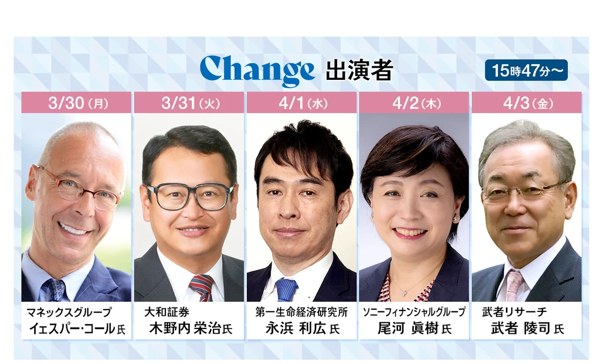 初日となる3月30日には新コーポレートロゴを掲げて新スタジオから放送を開始します。テーマは「Change(変化)」で、激変する市場環境を踏まえ、投資家や視聴者が知りたいテーマについて各界第一線のゲストとともに議論や解説を行います。