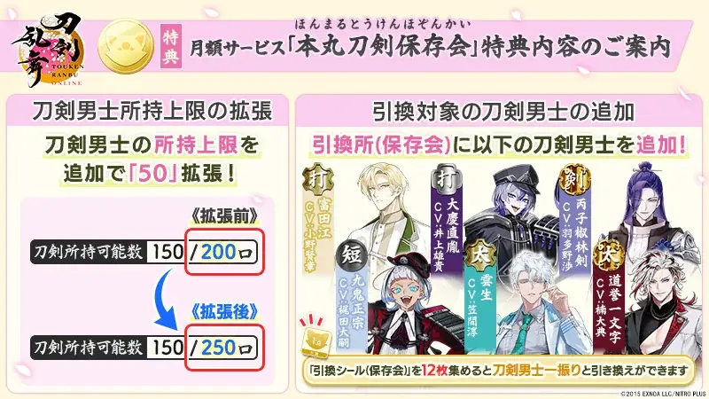 | 本丸刀剣保存会 | 刀剣男士所持上限が50に拡張。引換対象の刀剣男士が6振り追加 |