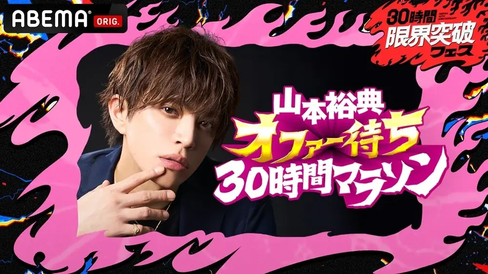 『愛のハイエナ』の名物企画として注目を集めた「山本裕典、ホストになる。」に続き、山本裕典が今回の『30時間限界突破フェス』で『山本裕典 オファー待ち30時間マラソン』に挑戦します。放送は4月11日(土)から4月12日(日)にかけての30時間マラソン形式で実施され、山本は長時間走りながら生放送中にリアルタイムで仕事のオファー獲得を目指します。