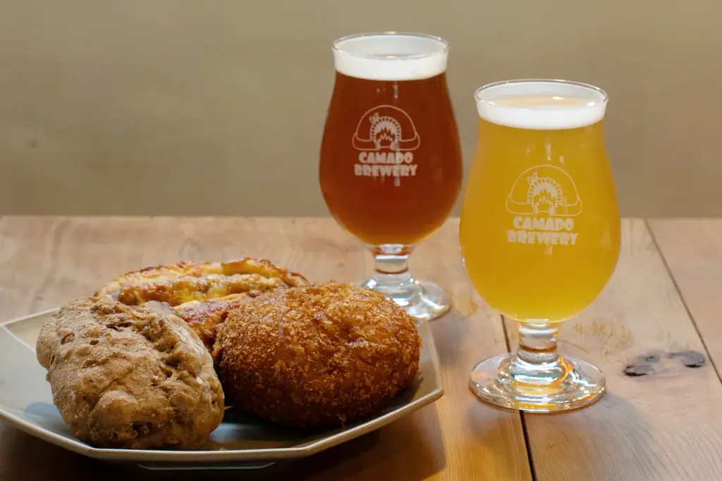 かまどパンは、麦芽カスを使用した独自のパンを主力とするほか、金賞受賞レシピのカレーパンなど既存の高評価商品も提供します。主なメニューには麦芽カス入りハードパン、金賞受賞レシピのカレーパン、ビールに合うおつまみパン等が並び、クラフトビールとのペアリングを意識した品ぞろえです。