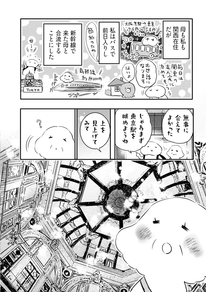 主人公である“私”(旅を仕事にする漫画家)は念願叶って、これまで外泊や旅行をほとんど経験してこなかった母を連れて関東旅行へ出発します。ところが東京駅で母が現れた際、壊れたサンダルを履いてきていたことで開始早々トラブルが発生します。靴探しに奔走するなどのドタバタが続きますが、旅の過程で母の抱えてきた過去の事情が明らかになっていきます。