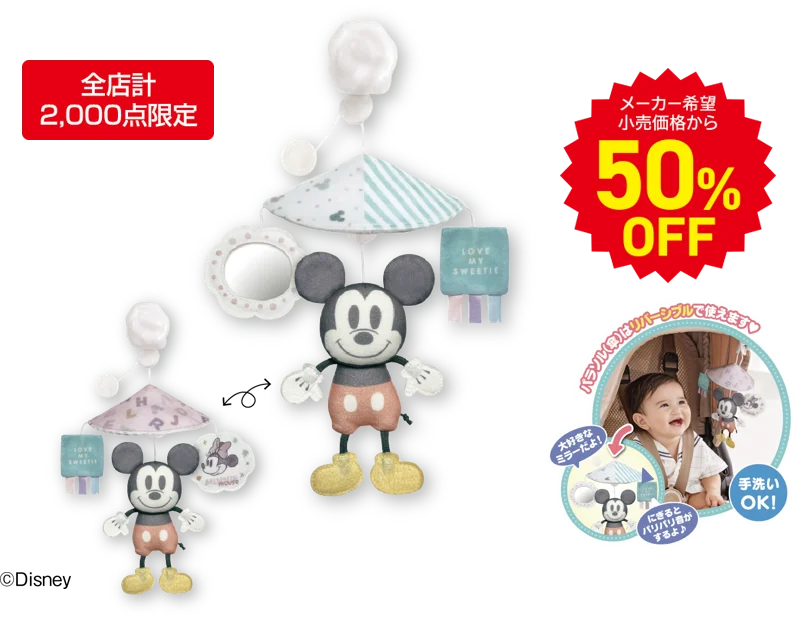 - ふんわりミニメリー くるりんパラソル ミッキー&ミニー:対象 0か月~、税抜価格 1,100円、税込価格 1,210円。フェア限定価格(メーカー希望小売価格 税込2,420円)。