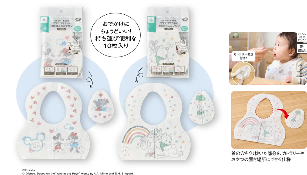 | フワフワやさしい3層式ミニエプロン | 10枚入り、デザイン:ミッキーマウス&ミニーマウス/くまのプーさん | 498円 | 547円 |