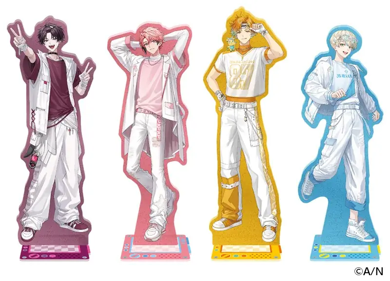フェアに合わせて撮りおろしビジュアルを用いたオリジナルグッズが多数発売されます。いずれも発売日は2026年4月2日で、各商品は4名(佐伯イッテツ/赤城ウェン/宇佐美リト/緋八マナ)のキャラクターごとにラインアップが用意されています。