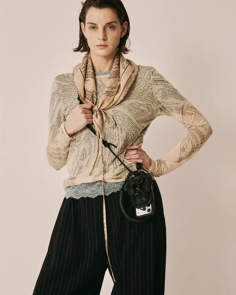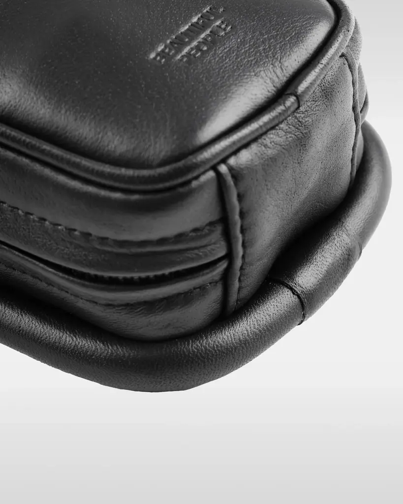 『DENWA leather bag』は黒電話を想起させる立体的なボディと、受話器を模したフラップを特徴とする3WAYレザーバッグである。コイル巻きの革紐や肩当てのコブラステッチ、ラバー製の底鋲など、過剰な装飾がデザインの主題となっている。