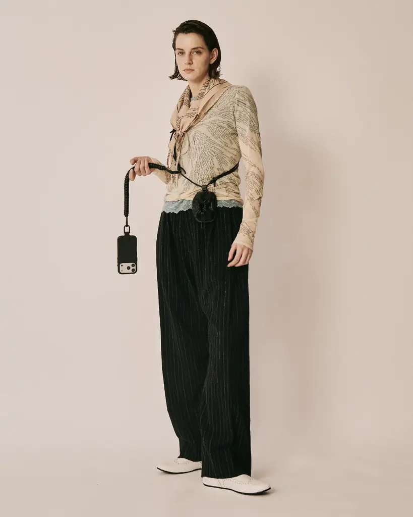 機能面では、前面にMagSafeを活用してiPhoneケースを外付けできる構造を採用。コイル巻きのコードとiPhoneケースをカラビナで連結し、MagSafeでバッグ本体に固定することで、デバイスとバッグを一体化する設計となっている。ストラップやハンドルの組み替えによりワンショルダー、ショートショルダー、ハンドバッグの3通りで使用可能だ。
