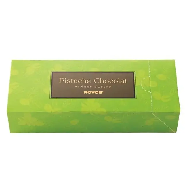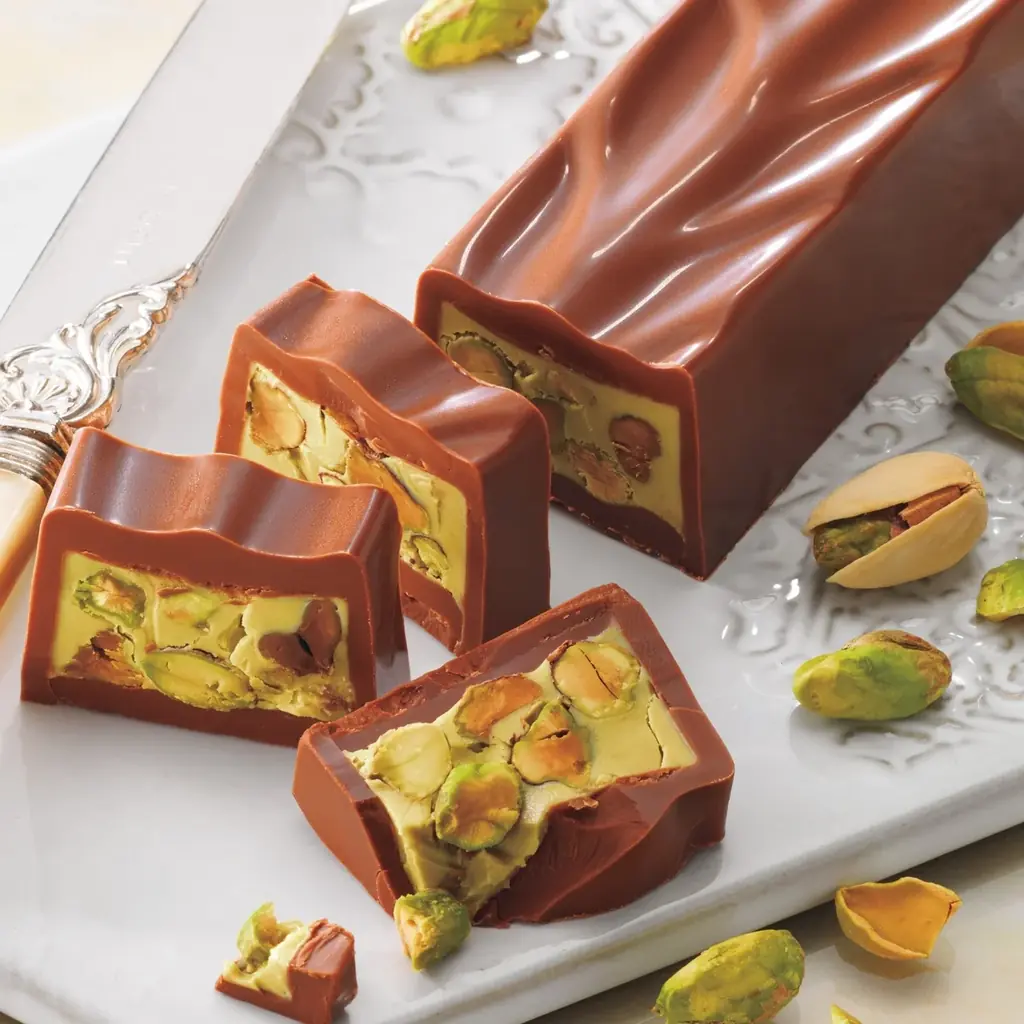 ピスタチオの風味を活かしたチョコレートで、香ばしくコク豊かなピスタチオクリームに、深煎りしたピスタチオと塩がけしたピスタチオの2種類を混ぜ込み、まろやかなミルクチョコレートに閉じ込めた商品です。食べる際は好みの厚さに切り分けるスタイルが案内されています。