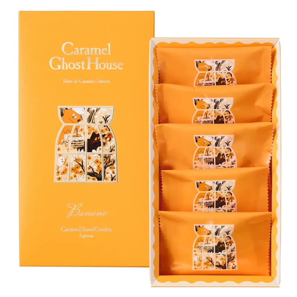 キャラメルゴーストハウスの期間限定商品「キャラメルサンドクッキー バナーヌ」は、炊き上げたキャラメルに紅茶葉または紅茶パウダーとバナナを加え、ココナッツを効かせたクッキーで挟むことで、バナナの香りとキャラメルの芳ばしさを爽やかに引き立て、すっきりした後味を目指した商品です。パッケージにはバナナ型の窓が設けられ、ブランドの物語性が反映されています。