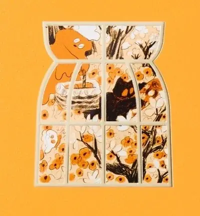 - バナナ型の窓を設置。窓の向こうにキャラメルオバケと黒猫メルちゃんのイラストが配置され、ブランドストーリーを視覚化。